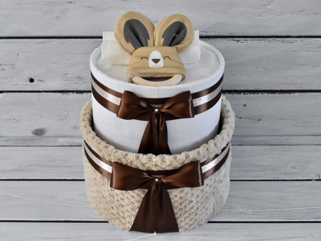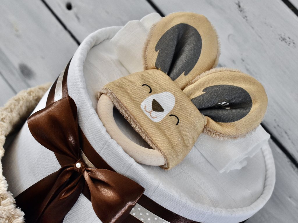Ababu je skvělá česká značka a my jsme moc rádi, že jejich produkty jsou zpět na našich dortechNEdortech. Vybrali jsme hryzátko medvídka v neutrální hnědé barvě, doladili ho béžovou dekou a tmavě hnědou stuhou. V náplni najde maminka spoustu praktických věcí. Prostě ideální dárek pro miminko