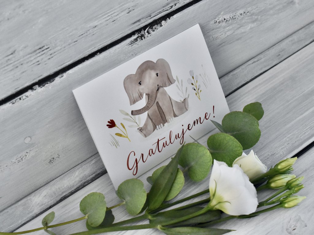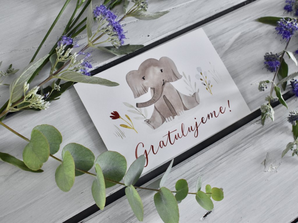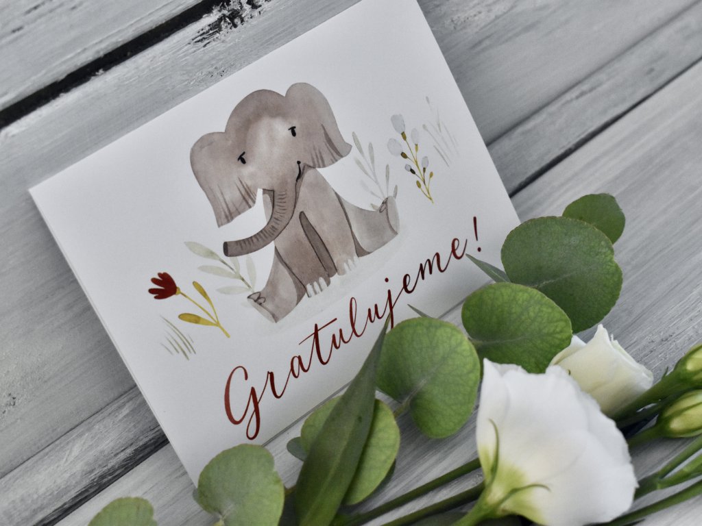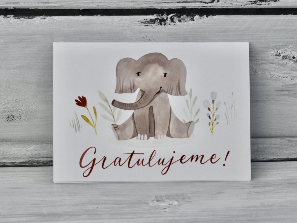 Přáníčko "Gratulujeme" se sloníkem