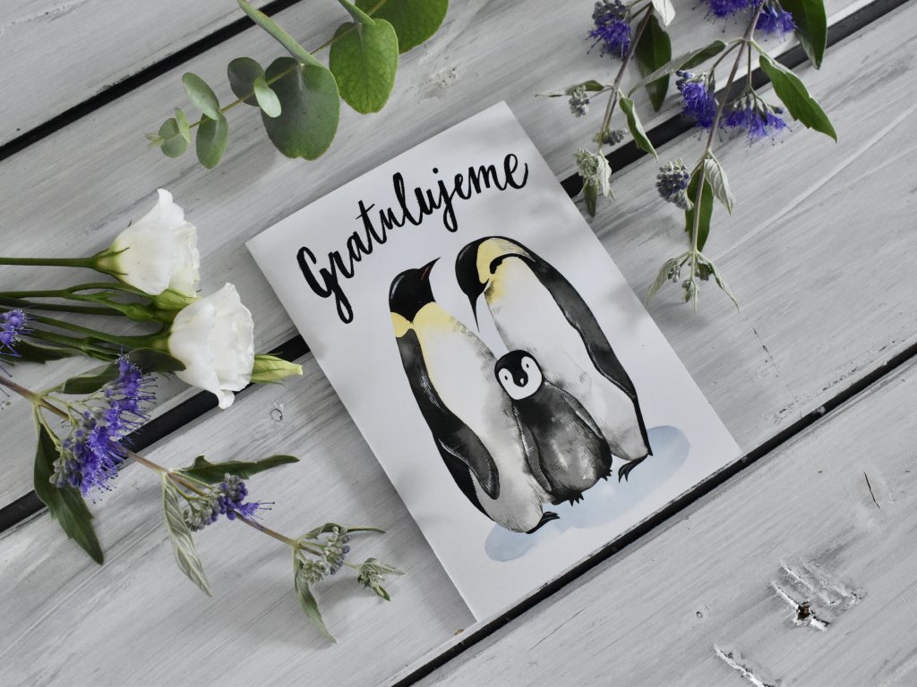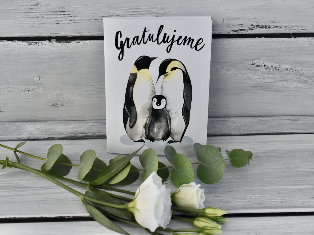Krásné přání s motivem rodinky tučňáků a nápisem „Gratulujeme!“. Ideální doplněk k plenkovému dortu. Velmi hezká ilustrace v neutrálních barvách, která se hodí pokud nevíte, jestli se narodí holčička nebo chlapeček. Díky univerzálnímu nápisu „Gratulujeme!“ jej využijete nejen k narození miminka, ale také k oslavám nebo křtinám.